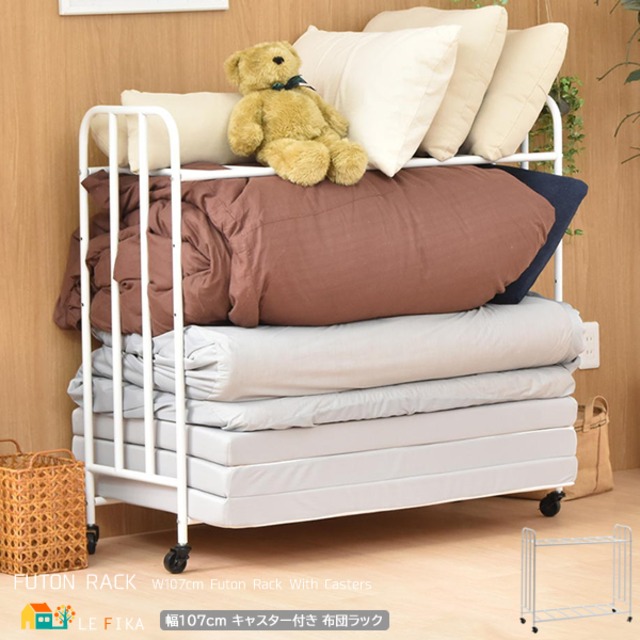 布団ラック 107cm幅 ホワイト 布団収納ラック 2段収納ラック キャスター付きラック 敷き布団収納 掛け布団収納 折り畳みマットレス収納 幅107cm 奥行40cm 高さ101.5cm 棚高さ調整可能 おすすめ おしゃれ キャスター付きふとん収納ラック ふとんラック 丈夫 スチール製 収納