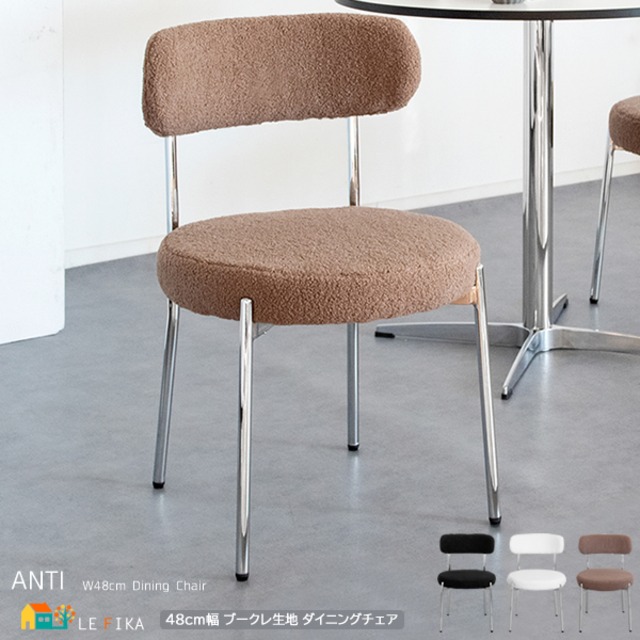 ダイニングチェア 48cm幅 ブラック グレージュ ホワイト ブークレ生地 肘掛け無し 肘置き無し アームレスチェア 円形座面 丸型座面 おすすめ おしゃれ モダン スタイリッシュ スチール脚 ブークレ デスク用チェア ワークチェア 幅48cm 奥行50cm 高さ74cm 座面高44.5cm 椅子