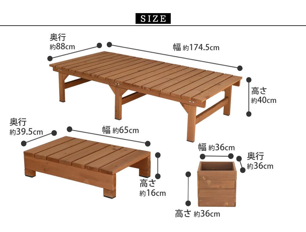 デッキ 縁台1台 ステップ1台 プランター2個 4点セット ライトブラウン ダークブラウン 茶色 木製デッキ 木製縁台 木製ステップ 木製プランター おすすめ おしゃれ 北欧 DIY ガーデニング ウッドデッキ 木製 天然木 杉材 縁台幅174.5cm 縁台奥行88cm 縁台高さ40cm