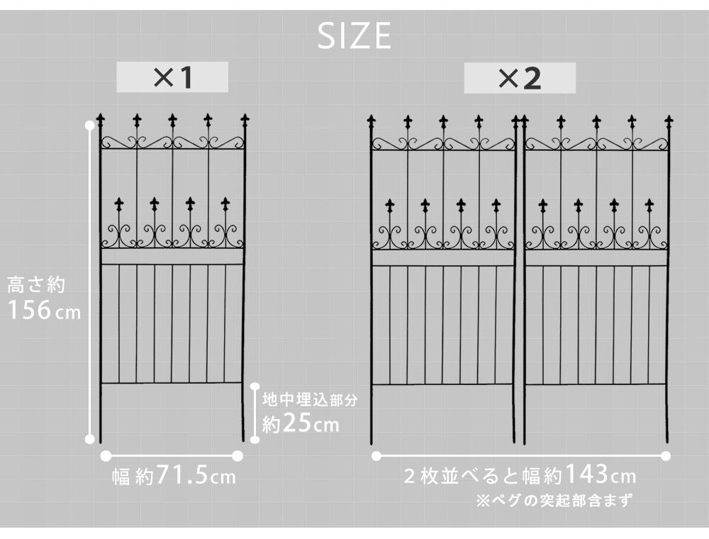 幅71.5cm、高さ156cmのロータイプのアイアンガーデンフェンス2枚セットです。