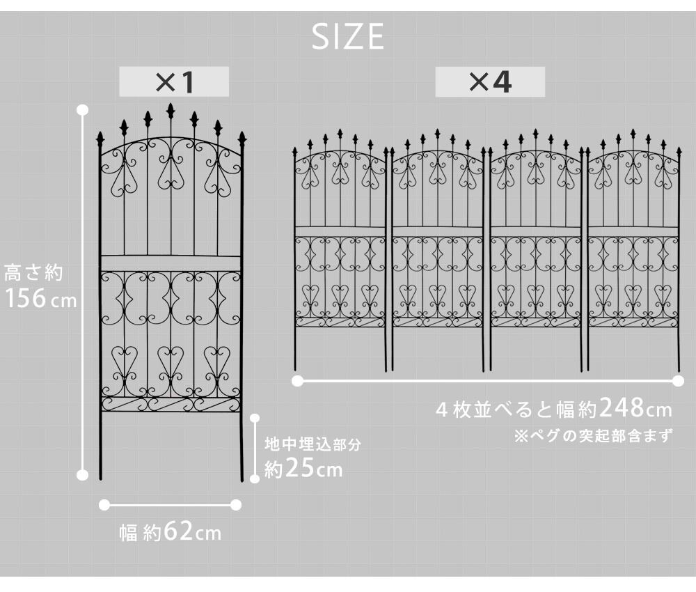 幅62cm、高さ156cmのロータイプのアイアンローズガーデンフェンス同色4枚セットです。