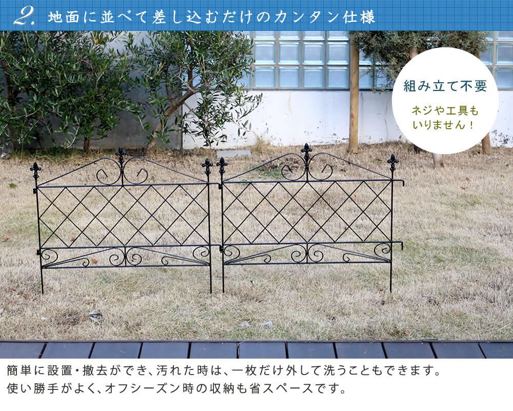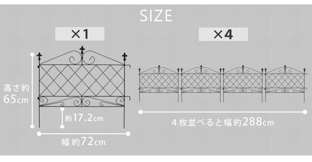 設置は地面に差し込むだけの簡単設置が可能な幅72cm、高さ65cmのロータイプのアイアンガーデンフェンス4枚セットです。