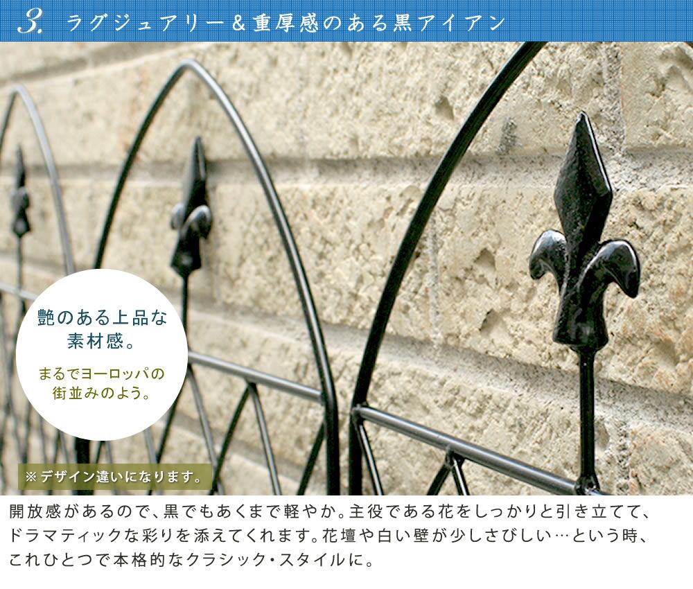 直角のエッジを作ったり、四方を囲んで花壇を作ったり、お庭で自由に設置が楽しめるエレガントなデザインのアイアンアプローチフェンスです。