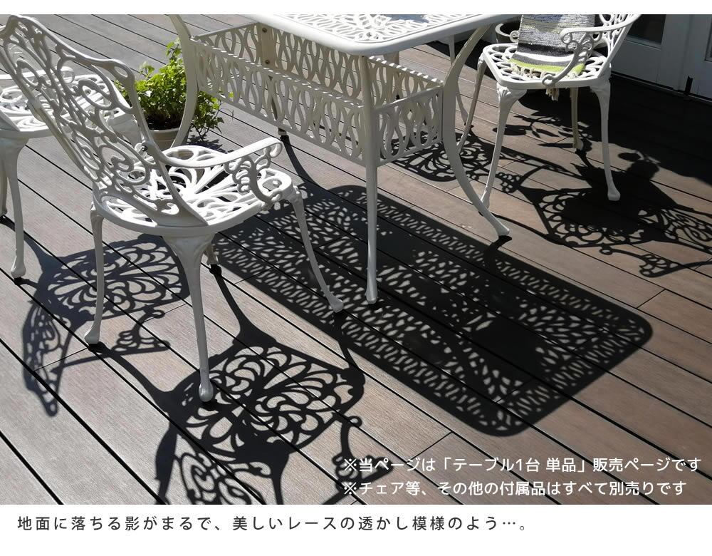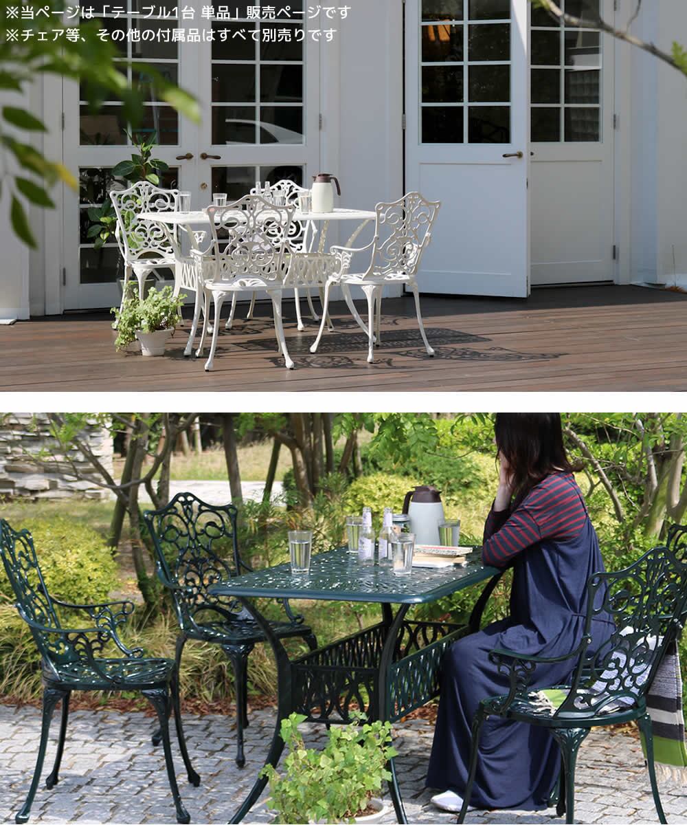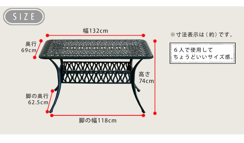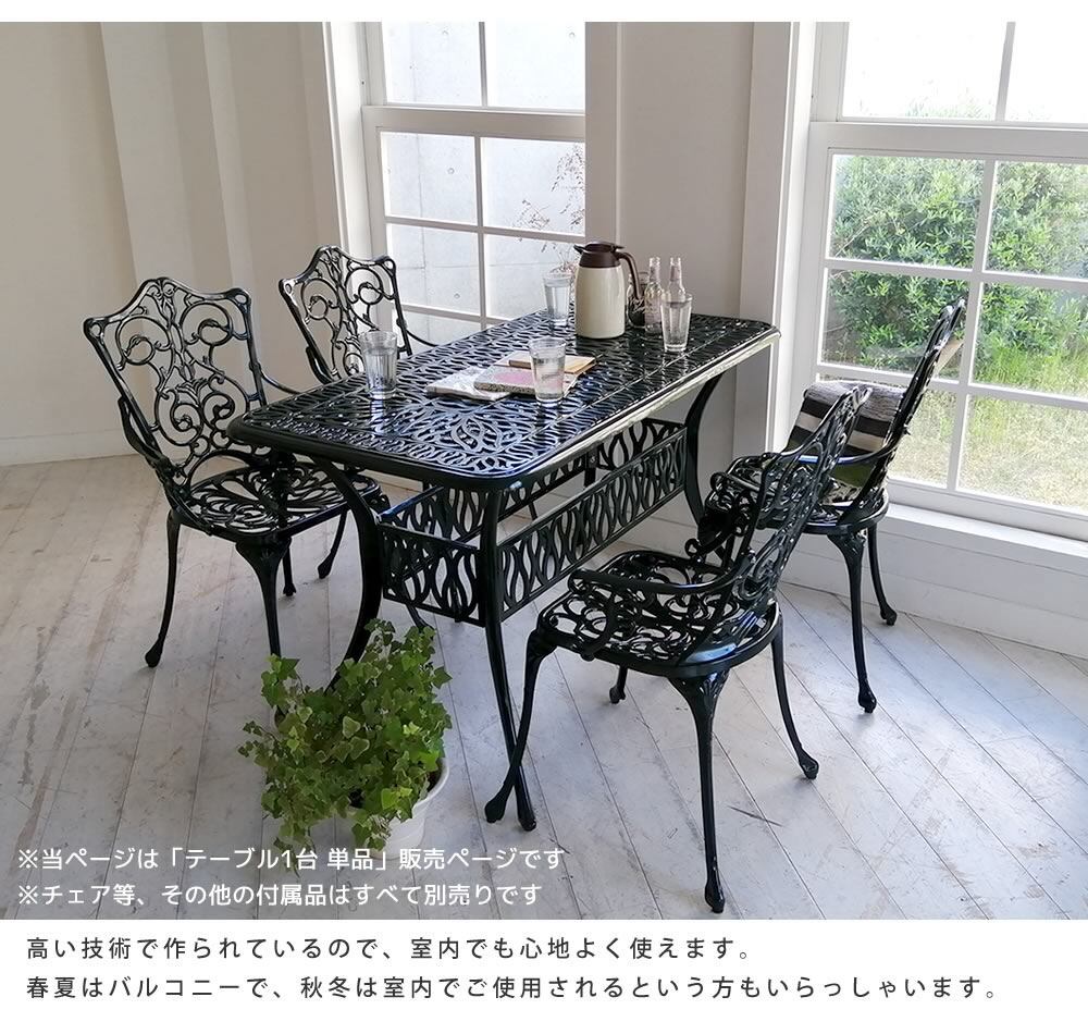 緻密で格調高い見た目ですが、アルミ製なので軽く、扱いやすい幅132cm、奥行69cmのガーデンテーブル1台単品です。