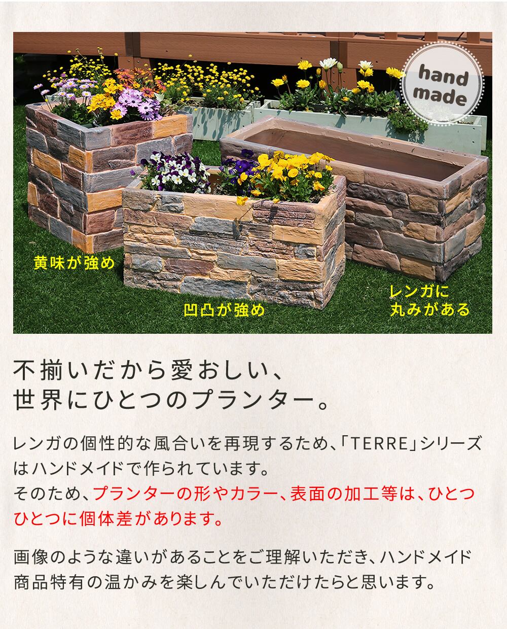 ・1点1点ハンドメイドで製造している為、プランターの形やカラー、表面の加工に個体差がございます。