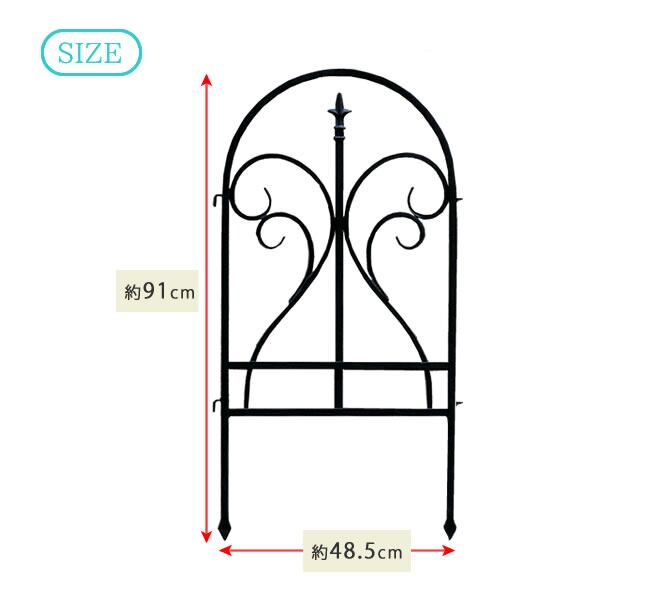 地面に挿すだけで簡単に設置できる幅48.5cm、高さ91cmのアイアンガーデンフェンス3枚セットです。
