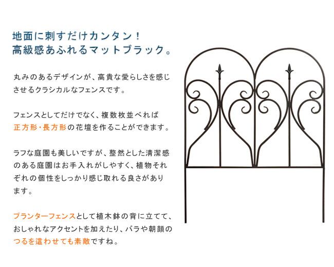 地面に刺すだけで簡単に設置できる幅61.5cm、高さ79cm(地中埋め込み部分20cm)のアイアンガーデンフェンス1枚単品です。