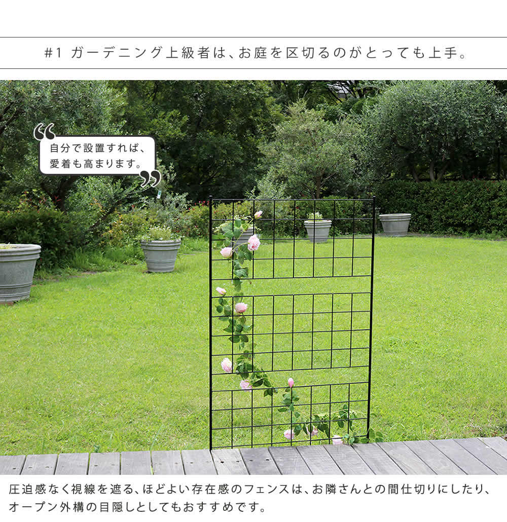 グリーンフェンスとしてバラやゴーヤなどをからませて、お世話するのにも適したサイズです。