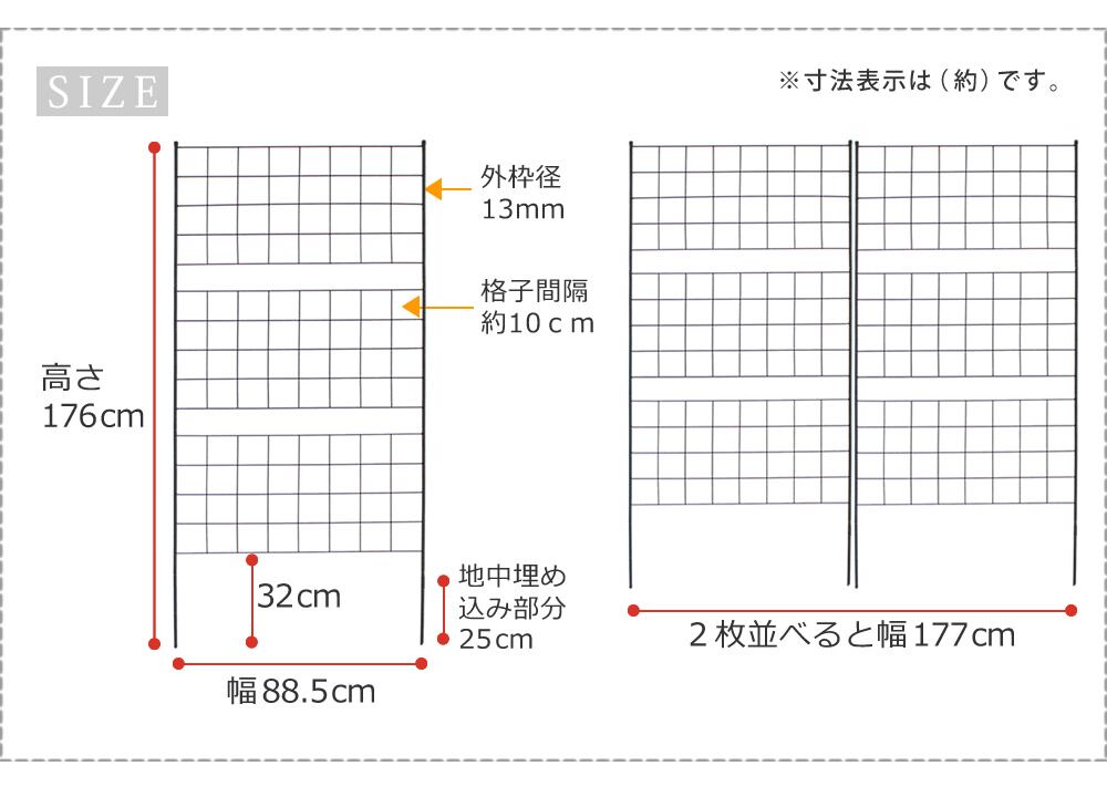 幅88.5cm、高さ176cmのハイタイプのアイアンガーデンフェンス2枚セットです。