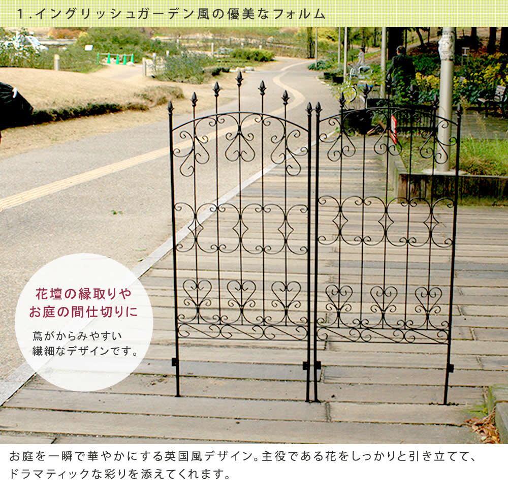 アンティークな曲線が美しいデザインの、幅62cm、高さ150cmのロータイプアイアンガーデンフェンス4枚セットです。