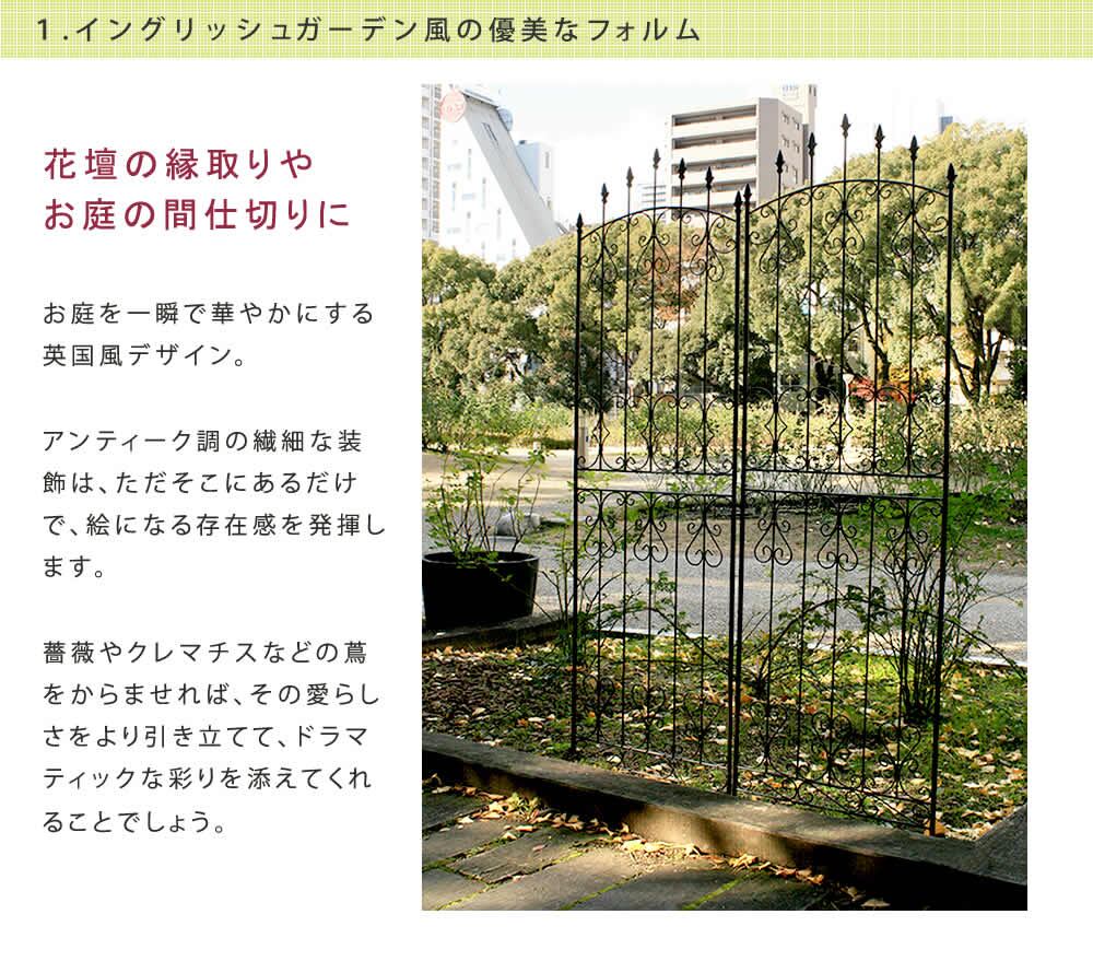 薔薇をからませるのにピッタリな幅62cm、高さ219cmのハイタイプのアイアンガーデンフェンス2枚セットです。