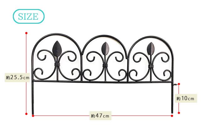 アンティークなフォルムの幅47cm、高さ25.5cmのミニサイズのアイアンガーデンフェンス3枚セットです。
