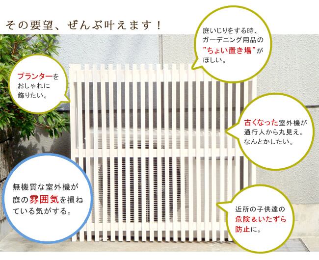 雨風で汚れがちな室外機をさりげなく、おしゃれにカバーします。