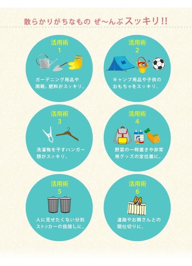 置き場所に困るもの、季節もの、防災グッズ、園芸用品、スポーツ・アウトドア用品、などまとめてすっきり収納できる収納庫です。