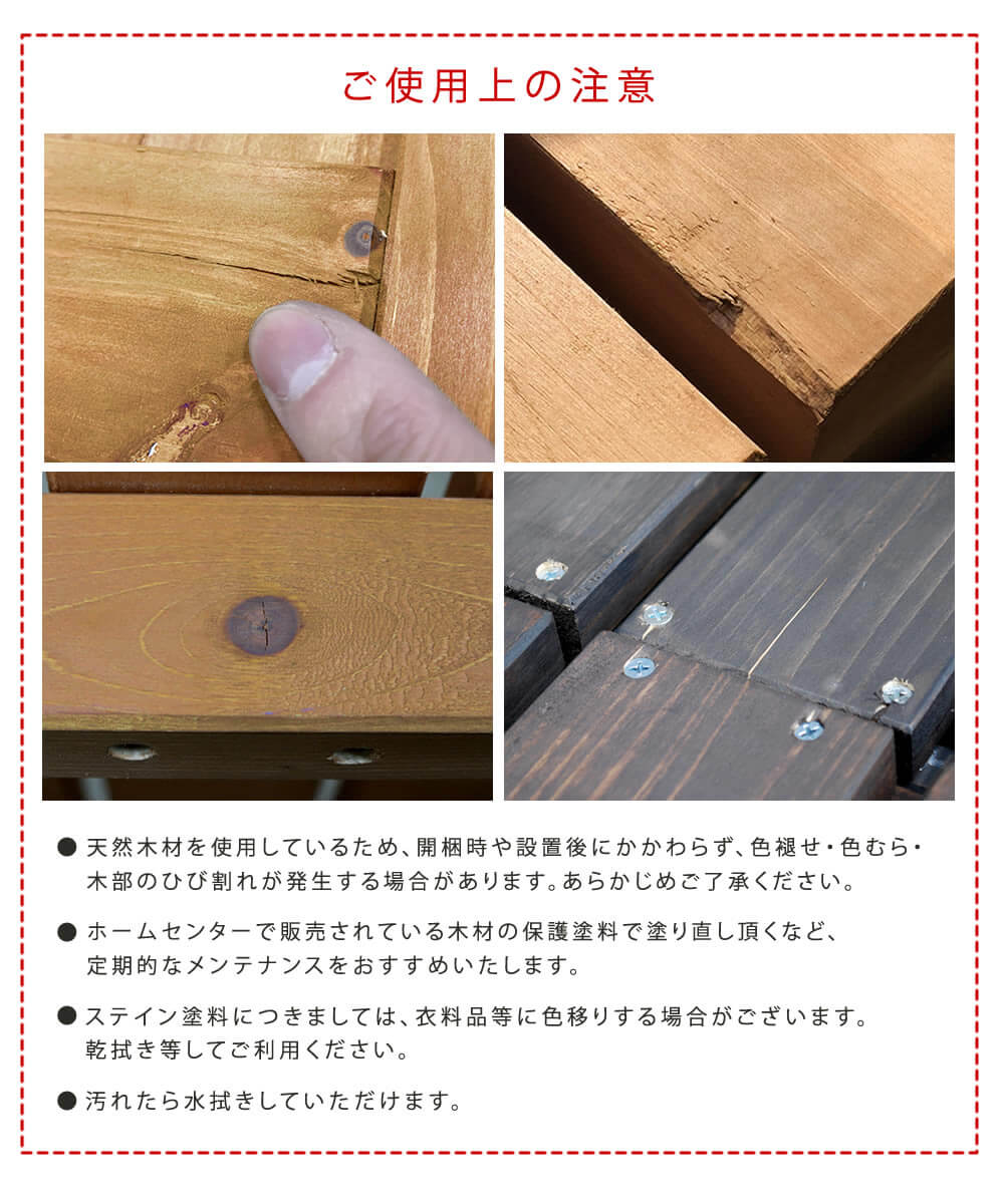 ・天然木を使用したガーデン・アウトドア商品には、天然木特有の節や、小さな傷、乾燥によるひび割れや反りなどがある場合がございますので、予めご了承下さいますようお願い申し上げます。