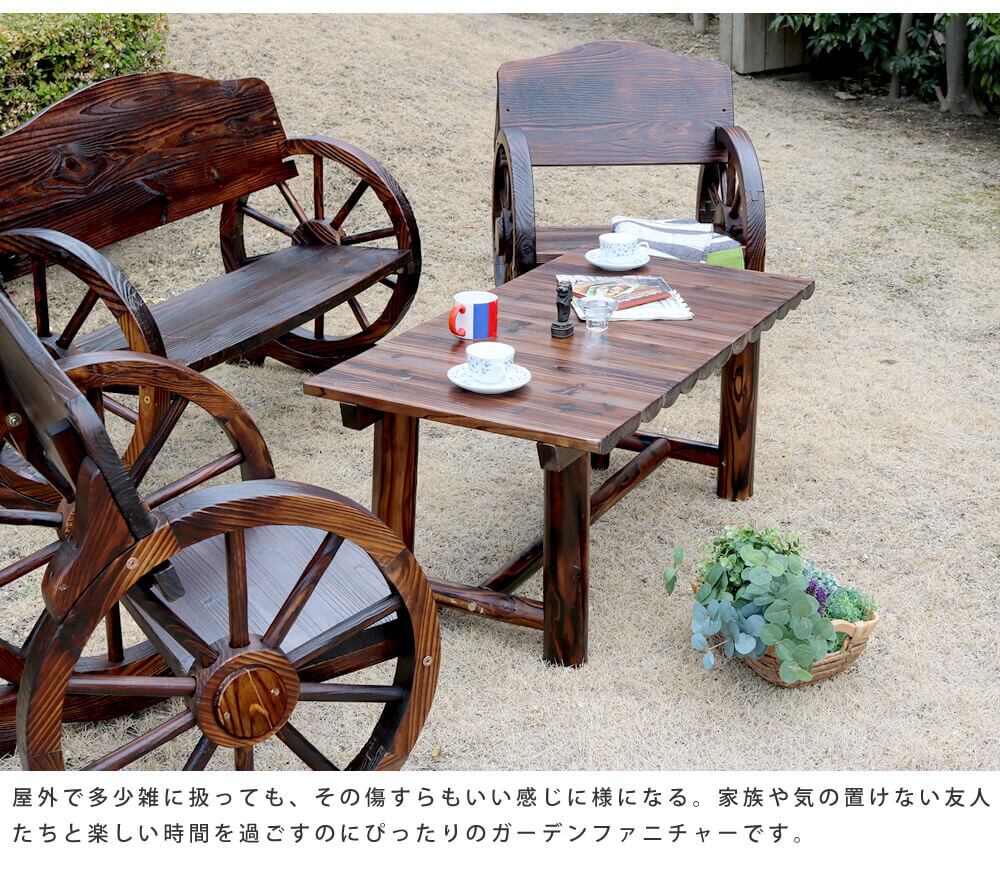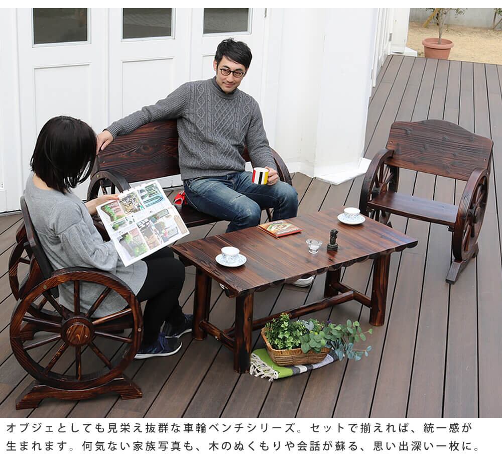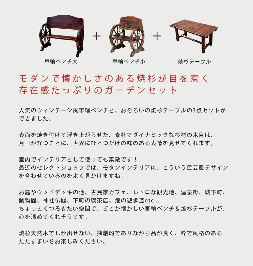 車輪ベンチ(大)、車輪ベンチ(小)、焼杉テーブルがセットになった合計3点セットです。