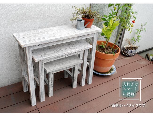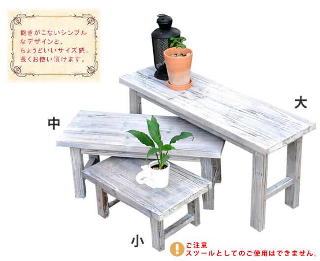 木目の美しさが印象的な、自然の素材感を最大限に味わえるホワイトスツール風のロータイプ花台3点セット(大×1、中×1、小×1)です。