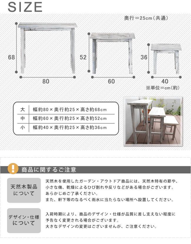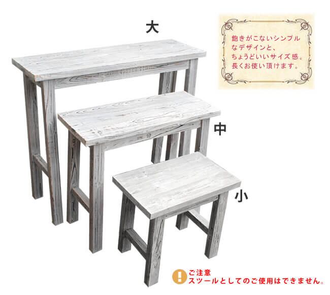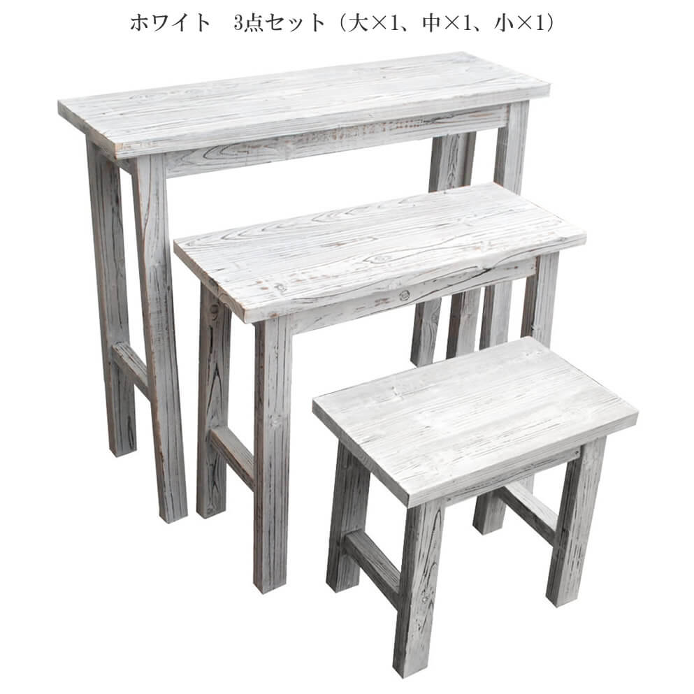 木目の美しさが印象的な、自然の素材感を最大限に味わえるホワイトスツール風の花台3点セット(大×1、中×1、小×1)です。