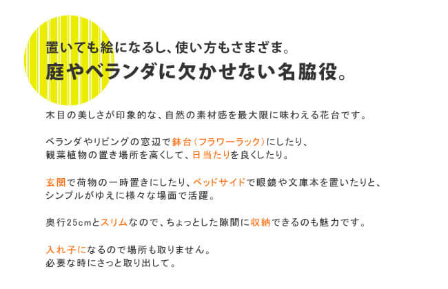 ・天然木を使用したガーデン・アウトドア商品には、天然木特有の節や、小さな傷、乾燥によるひび割れや反りなどがある場合がございますので、予めご了承くださいませ。