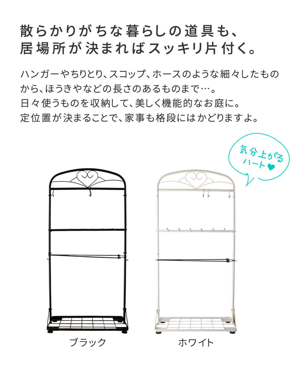 ハンガーやちりとり、スコップ、ホースのような細々したものから、ほうきやなどの長さのあるものまで、日々使うものを収納して、美しく機能的なお庭に片付けるのに便利なガーデンツールスタンドです。