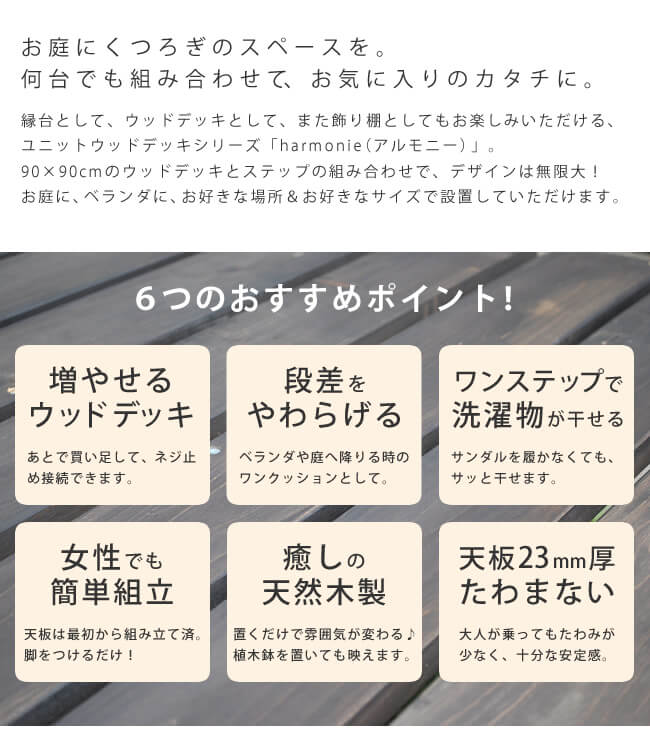 何台でも組み合わせて、お気に入りのカタチに設置できるユニットデッキ用の木製ステップです。