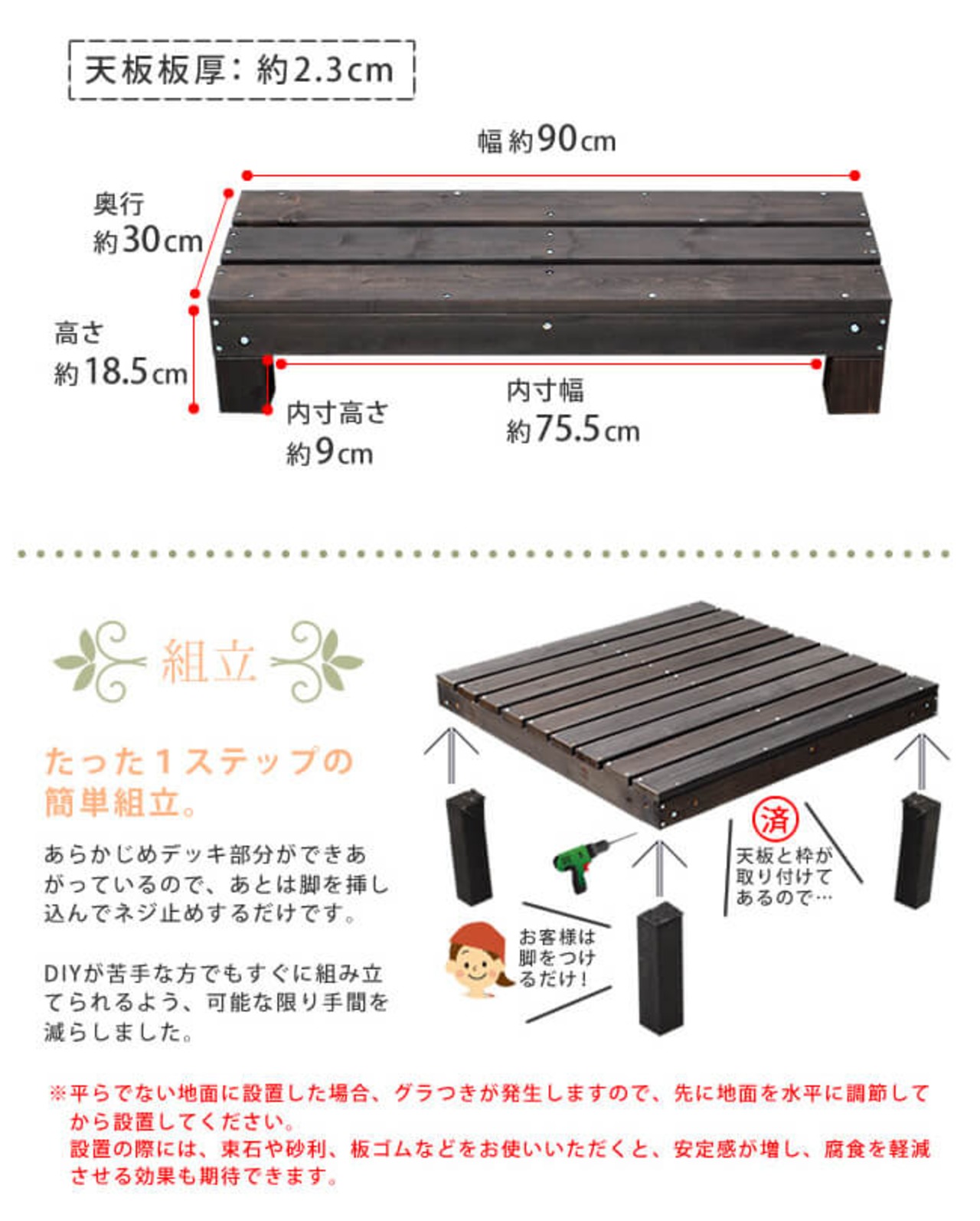 ・天然木のため、色褪せやひび割れが発生する場合があります。ホームセンターで販売されている木材の保護塗料で塗り直しいただくなど、定期的なメンテナンスをおすすめいたします。