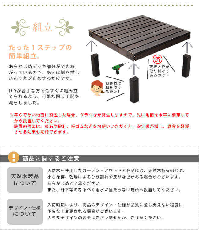 ・天然木のため、色褪せやひび割れが発生する場合があります。ホームセンターで販売されている木材の保護塗料で塗り直しいただくなど、定期的なメンテナンスをおすすめいたします。
