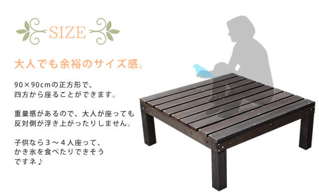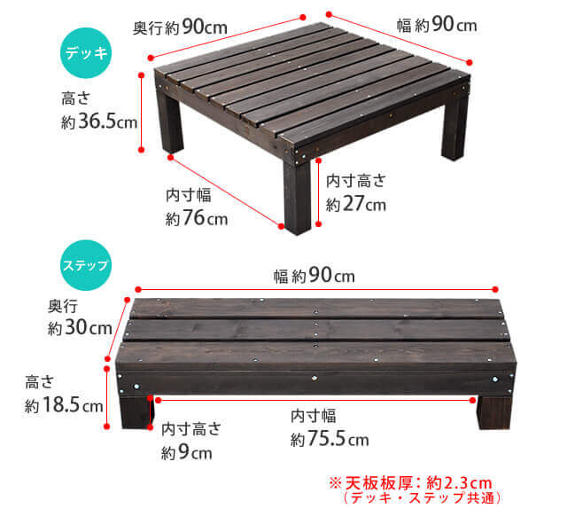 ・ウッドデッキ(1台あたり):幅90cm、奥行90cm、高さ36.5cm
