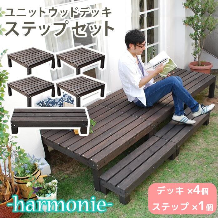 ユニットタイプのウッドデッキ4台とステップ1台、合計5点がセットになったウッドデッキセットです。