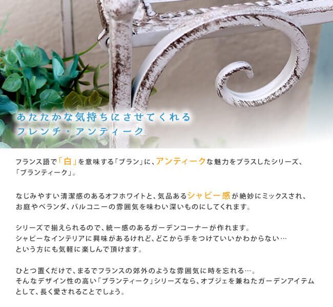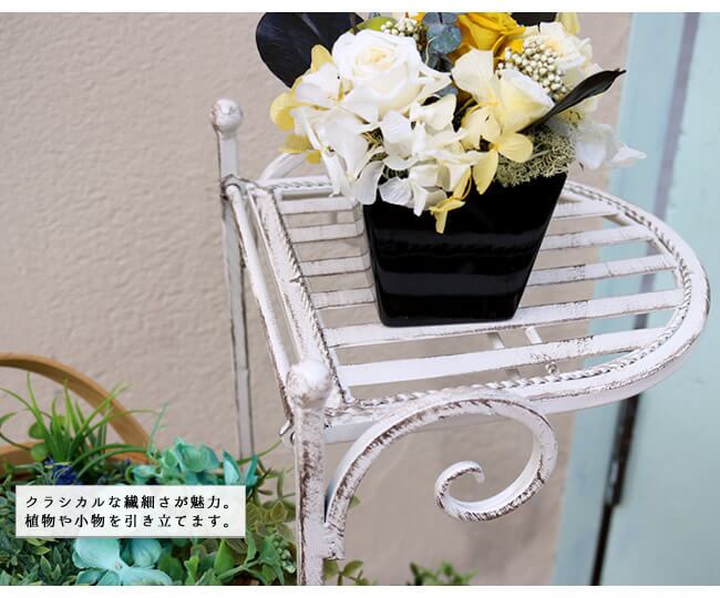 なじみやすい清潔感のあるオフホワイトと、気品あるシャビー感が絶妙にミックスされ、お庭やベランダ、バルコニーの雰囲気を味わい深いものにしてくれる縦型のホワイトアイアンフラワースタンドです。