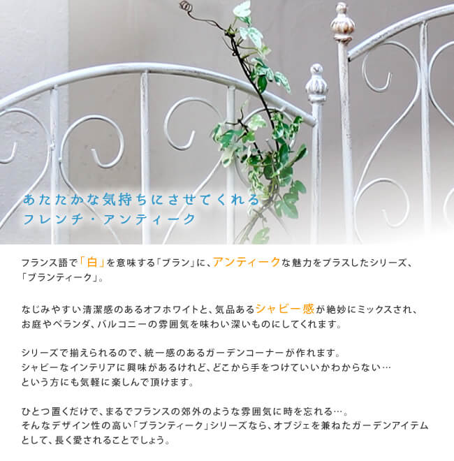 なじみやすい清潔感のあるオフホワイトと、気品あるシャビー感が絶妙にミックスされ、お庭やベランダ、バルコニーの雰囲気を味わい深いものにしてくれます。