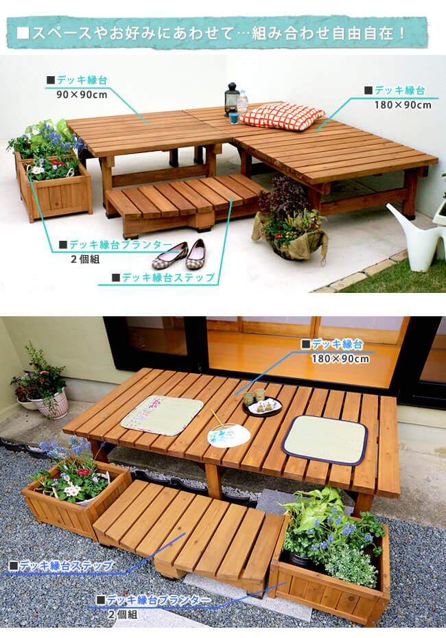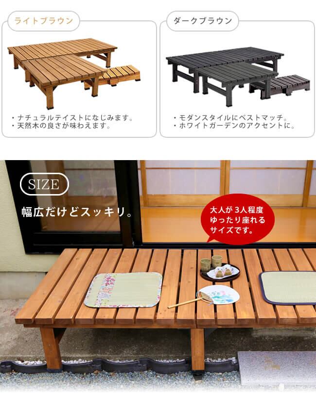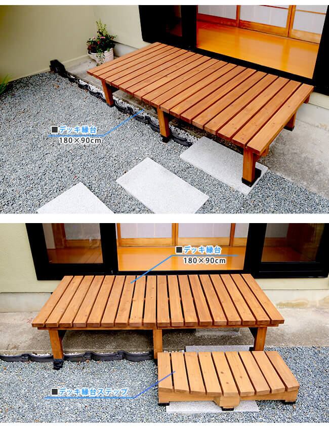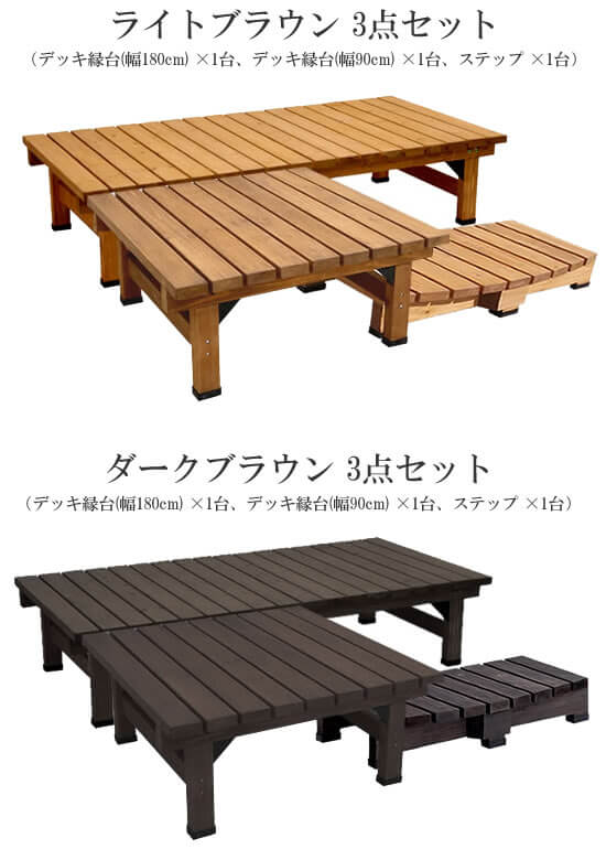 (※セット内容:デッキ縁台(幅180cm)×1台、デッキ縁台(幅90cm)×1台、ステップ×1台)