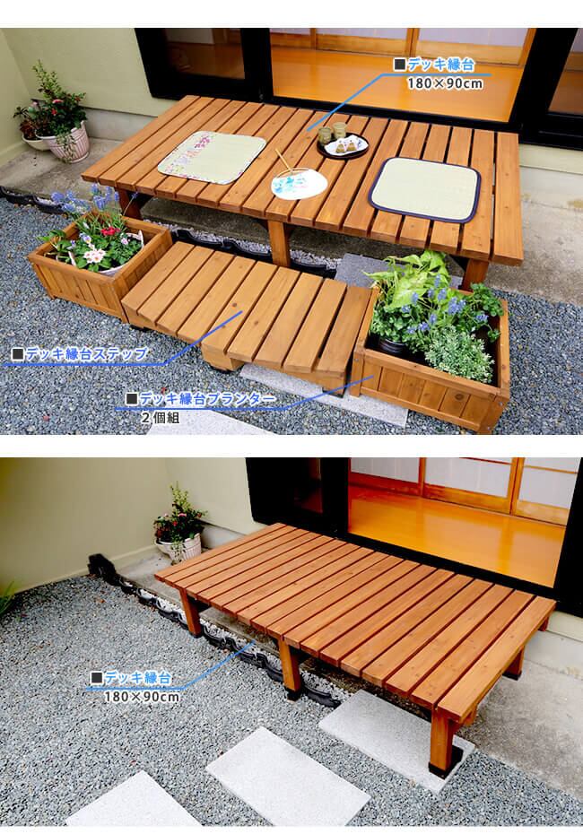 デッキ縁台(幅180cm、奥行90cm)とステップがセットになった木製デッキ縁台合計2点セットです。