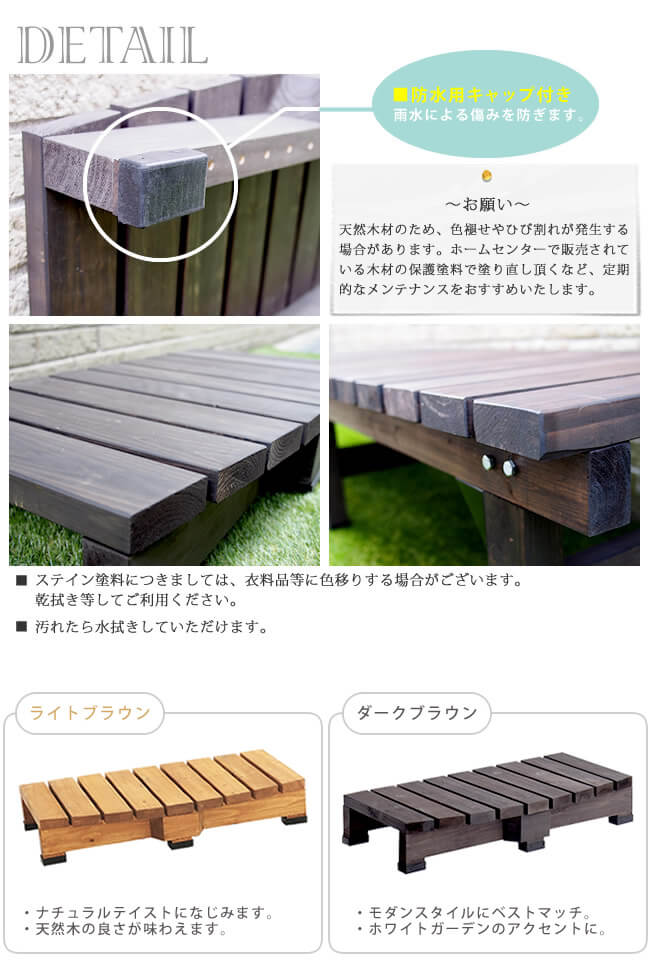・天然木のため、色褪せやひび割れが発生する場合があります。ホームセンターで販売されている木材の保護塗料で塗り直しいただくなど、定期的なメンテナンスをおすすめいたします。