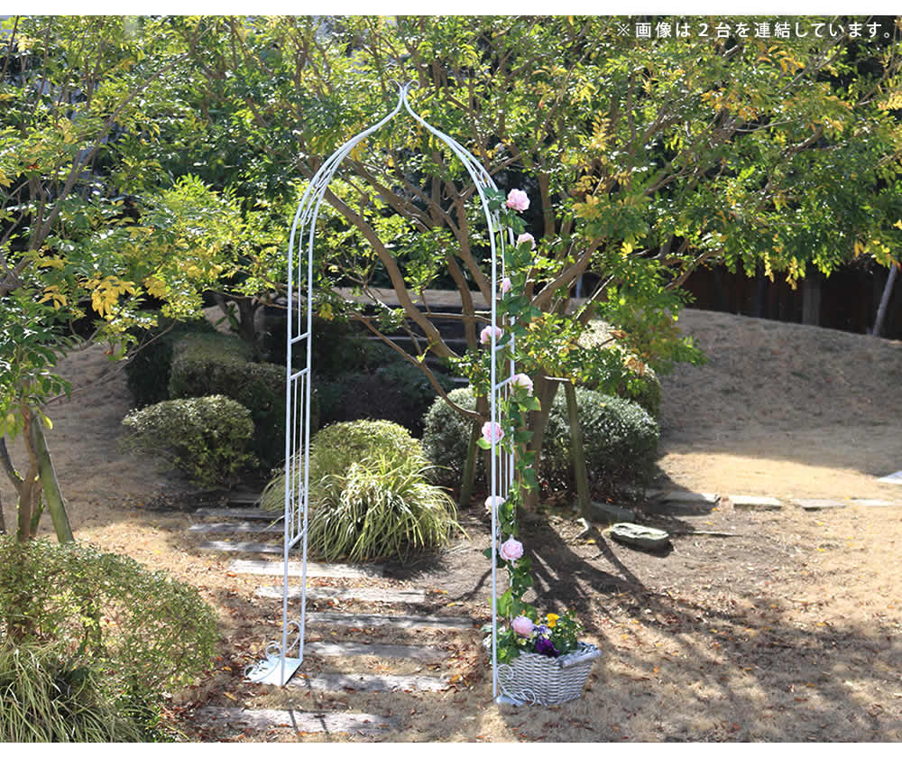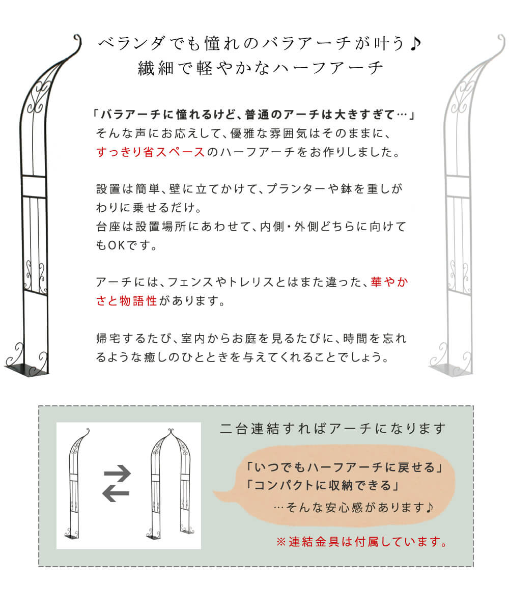 バラアーチに憧れるけど、普通のアーチは大きすぎて、という方におすすめの優雅な雰囲気はそのままに、すっきり省スペースのハーフアーチです。