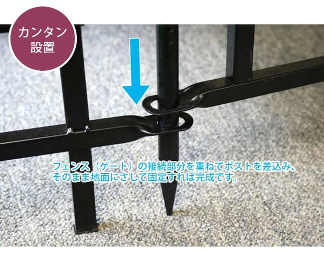 ・フェンスとあわせて設置の際には、基本的に埋め込み部分をしっかり埋め込んで頂ければ自立しますが、柔らかすぎる地面などでは倒れる恐れがありますので、お客様自身で固定いただくか、ご使用をお避けください。