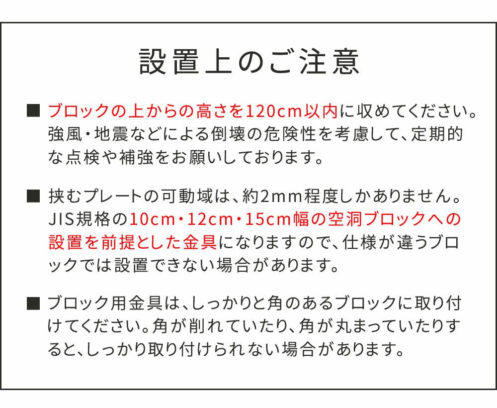 ・JIS規格の「10cm幅」の空洞ブロックへの設置を前提とした金具になります。ブロックの幅をよくご確認ください。