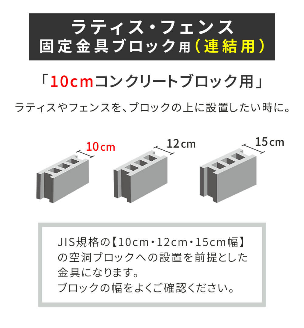 10cm幅のコンクリートブロックへ設置用のラティス・フェンス固定金具(連結用)6個セットです。