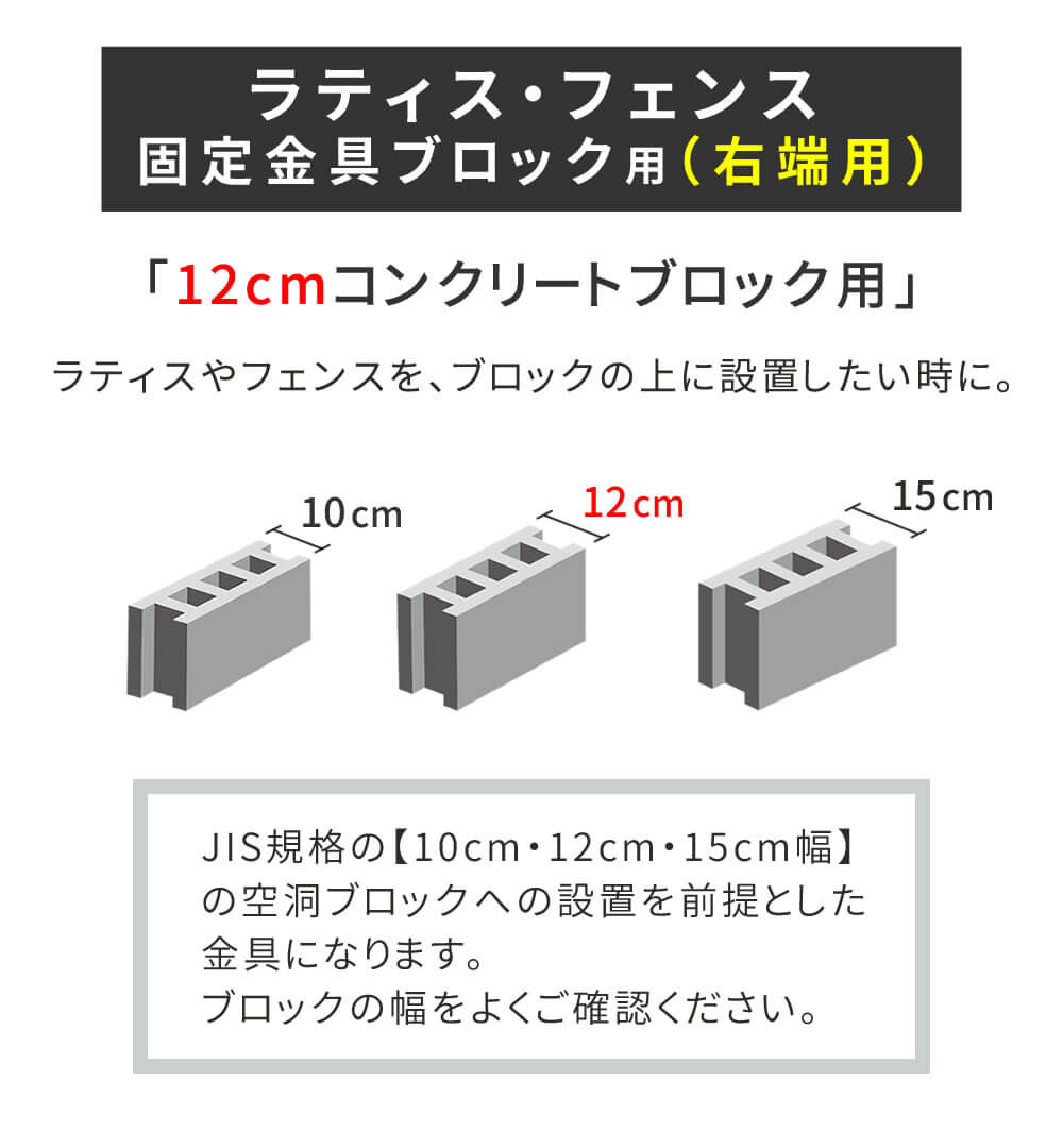 12cm幅のコンクリートブロックへ設置用のラティス・フェンス固定金具(右端用)1個単品です。