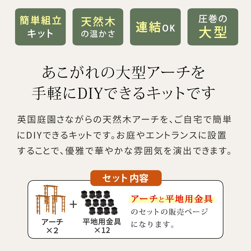 天然木製のガーデンアーチ3台と、平地用固定金具12個がセットになったガーデンアーチ3台組セットです。