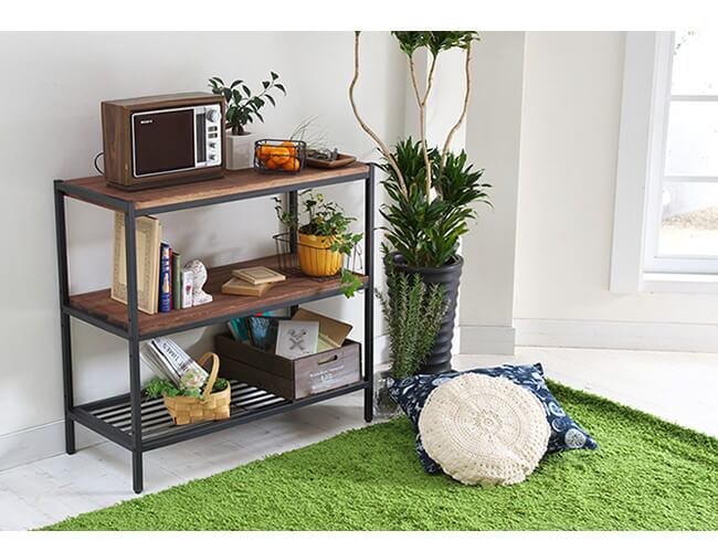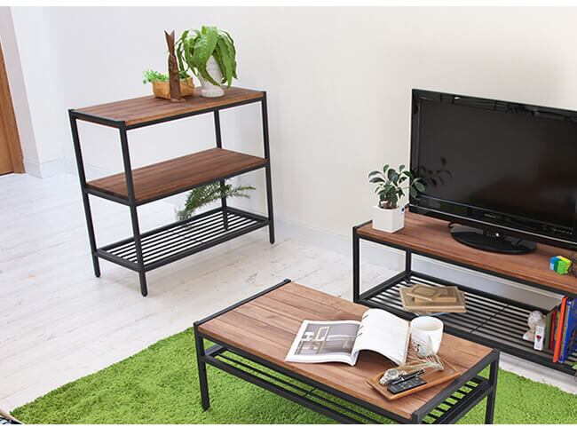 天板は四方をアイアンで縁取った、ミッドセンチュリー風のモダンなデザインで、まるでおしゃれな路面ショップのように、お気に入りの生活雑貨をディスプレイできそうです。