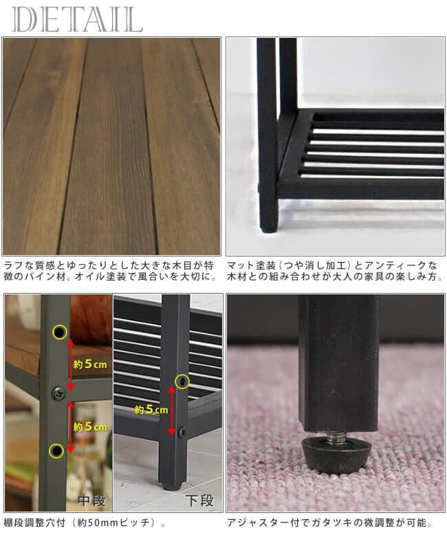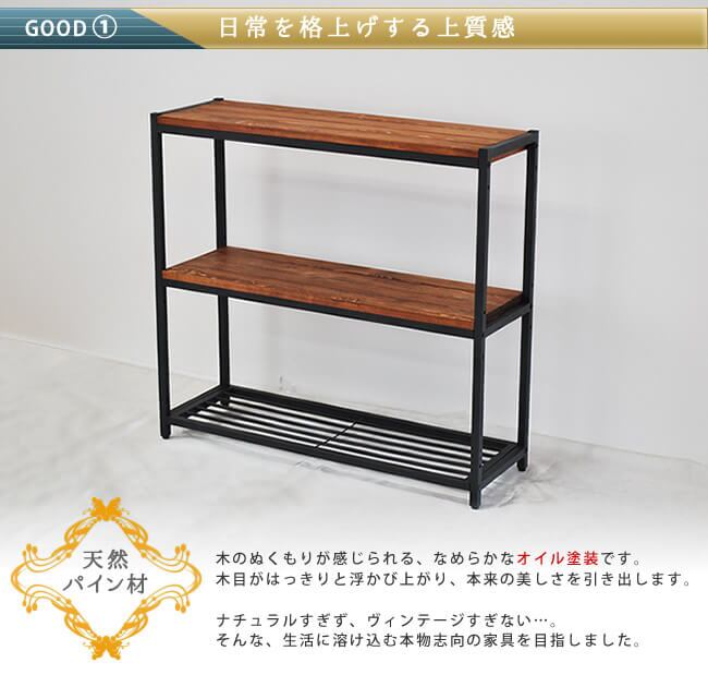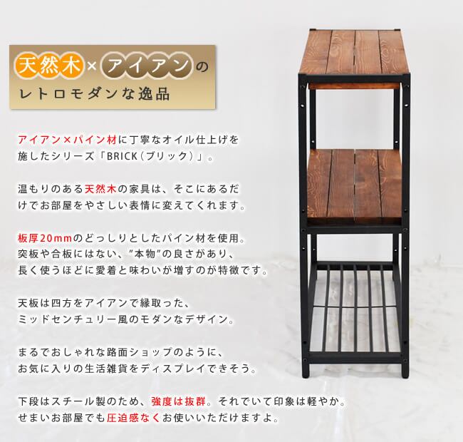 アイアンとパイン材に丁寧なオイル仕上げを施した天然木製の3段スリムラックです。