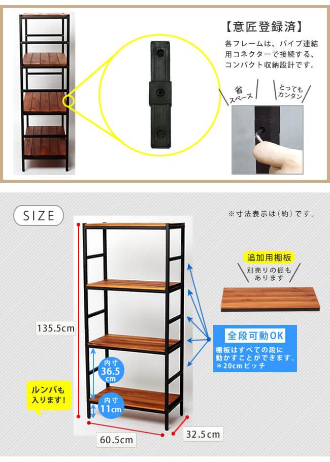 幅60.5cm、奥行32.5cm、高さ135.5cmの長方形タイプの4段収納ラックです。