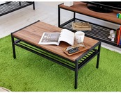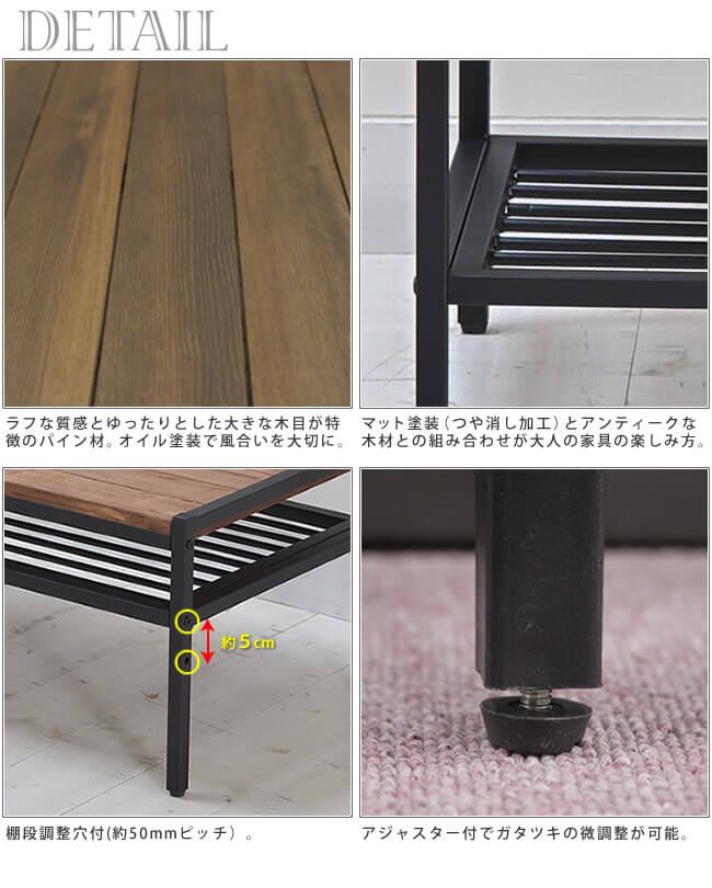 天板は四方をアイアンで縁取ったミッドセンチュリー風のモダンなデザインで、食事や来客時など、さっとリモコンや新聞、ティッシュやノートパソコンなどを下の棚に入れられて便利です。