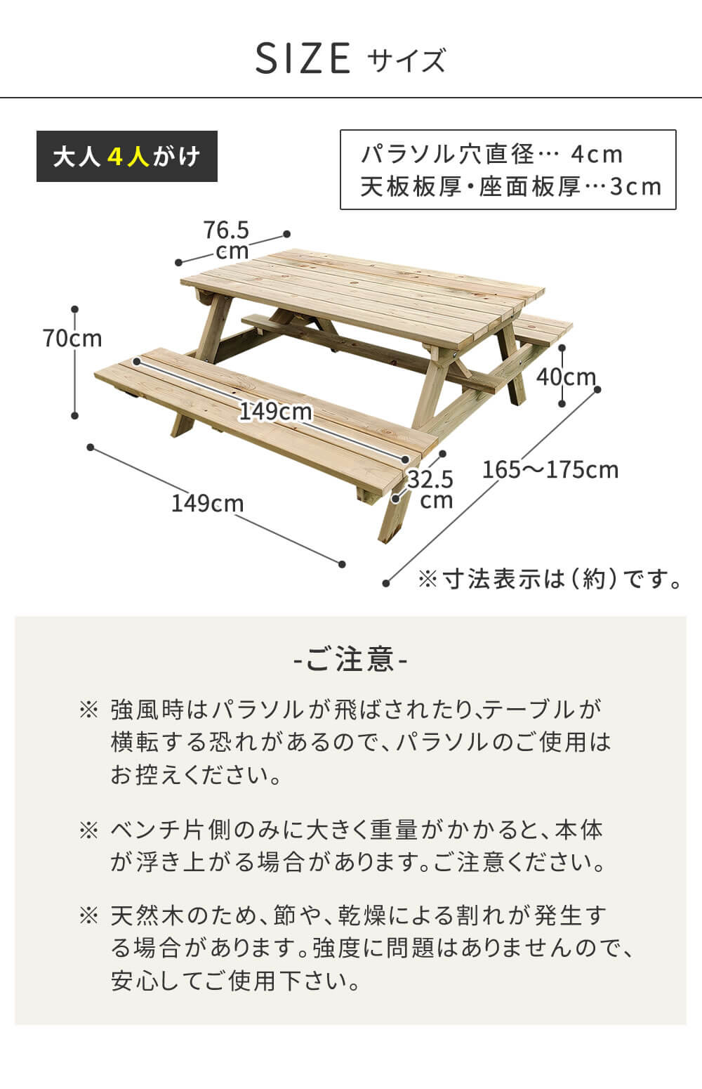 ・パラソル穴:直径4cm