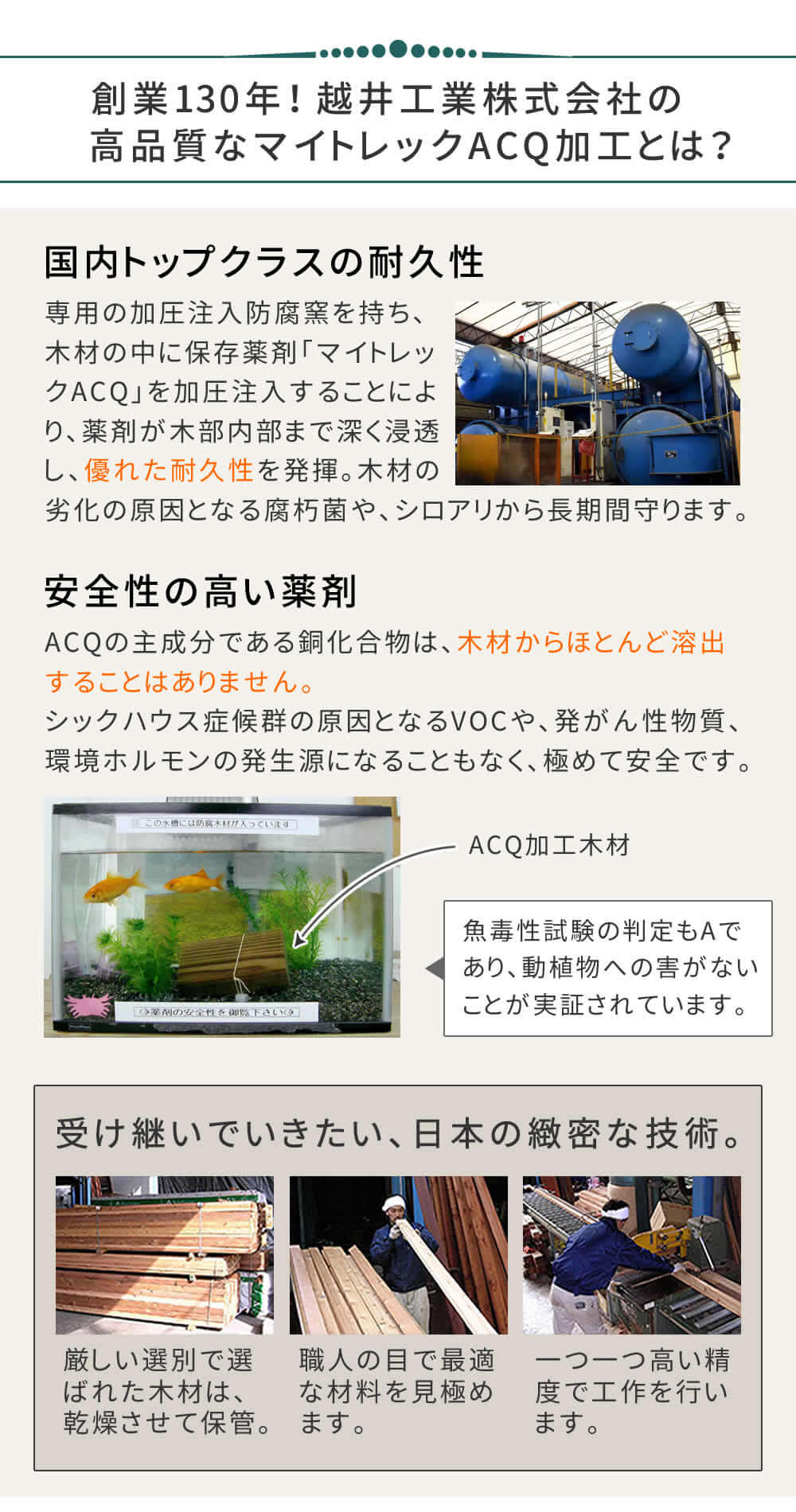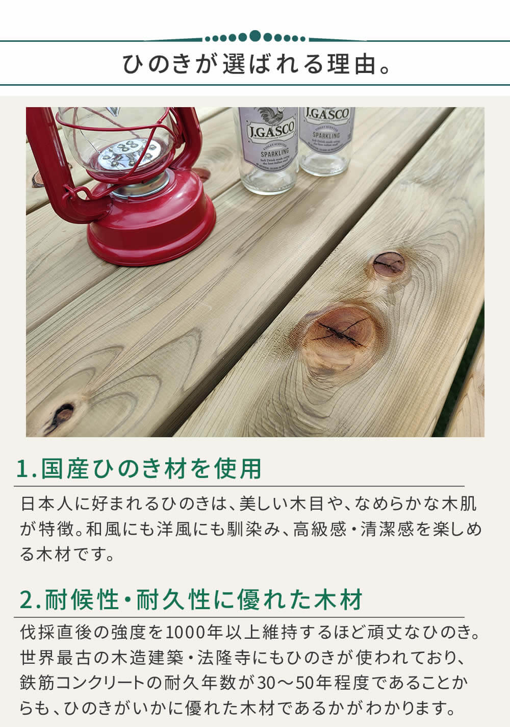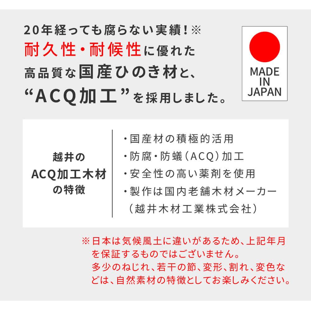 高品質な国産ひのき材をたっぷりと使用し、国内工場生産で安心安全で、防腐・防蟻(ACQ)加工で耐久性も抜群です。