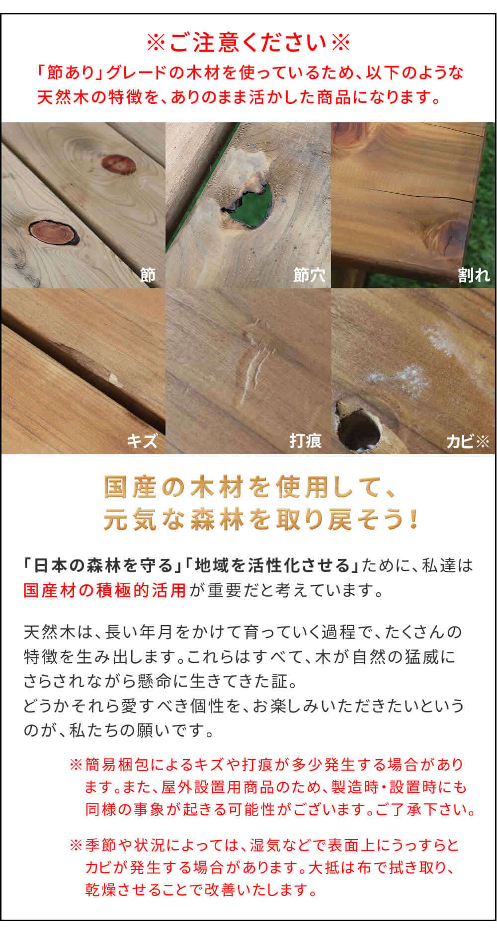 ※日本は気候風土に違いがあるため、上記年月を保証するものではございません。多少のねじれ、若干の節、変形、割れ、変色などは、自然素材の特徴としてお楽しみください。