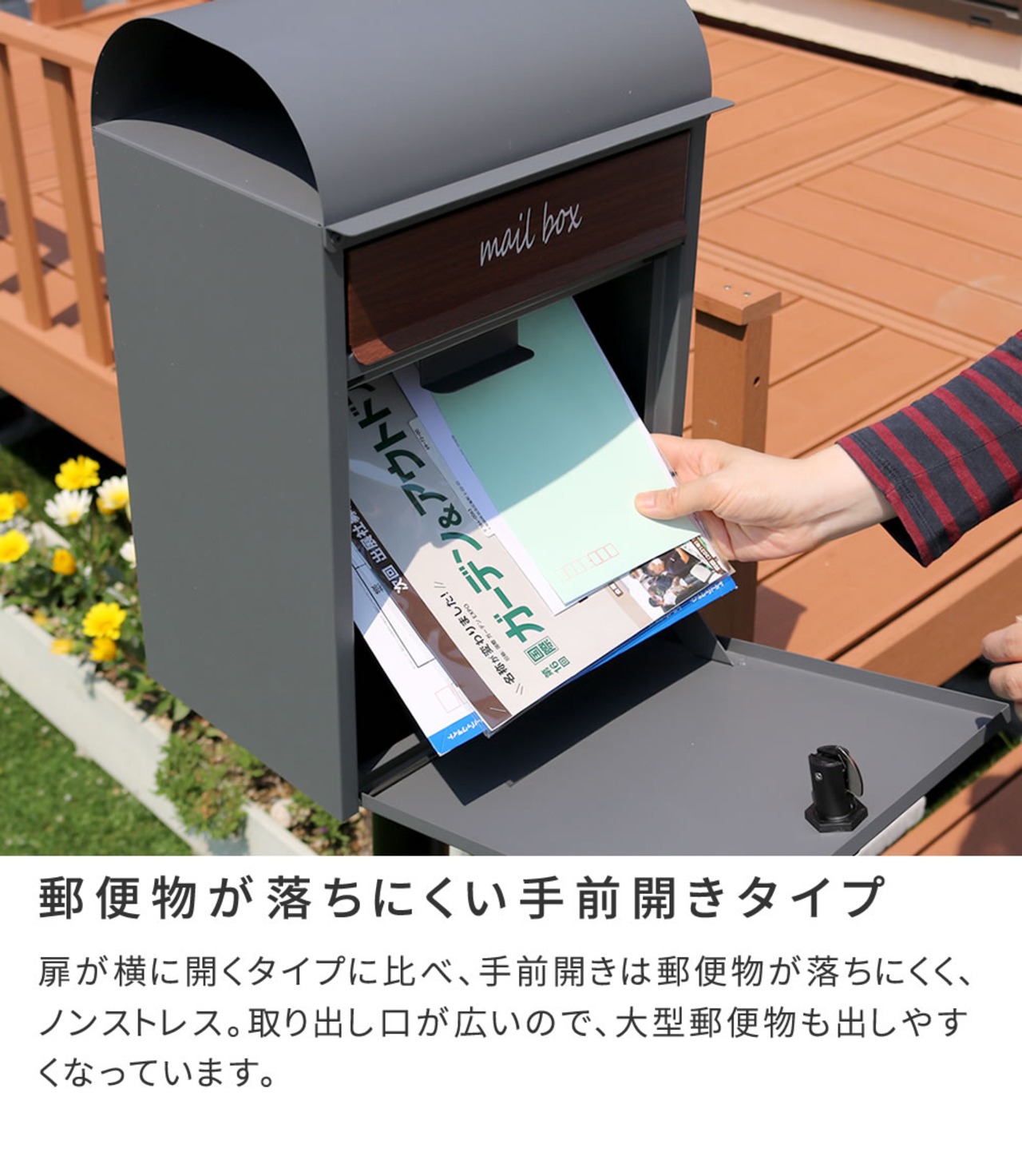 手前開きタイプで、郵便物が落ちにくく片手で郵便物を取り出せて便利です。