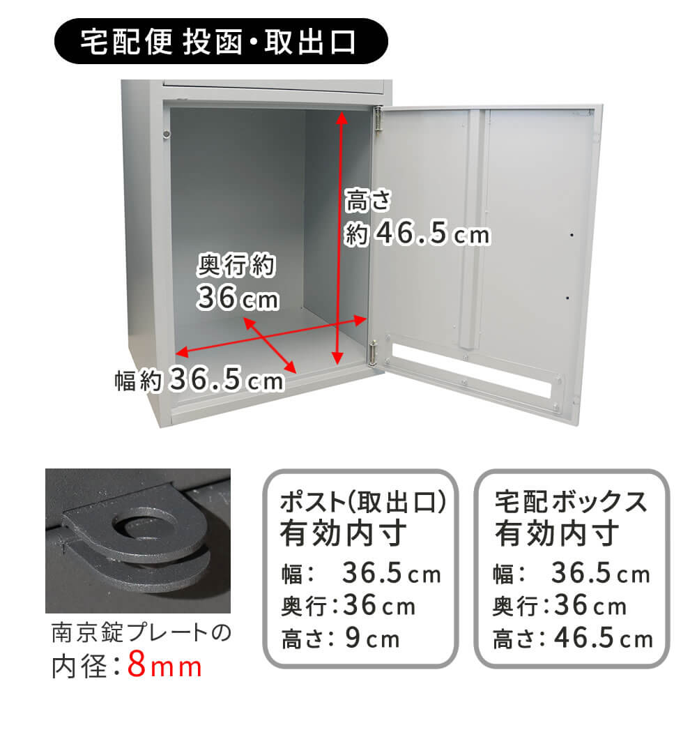 ・宅配ボックス:幅36.5cm、奥行36cm、高さ46.5cm