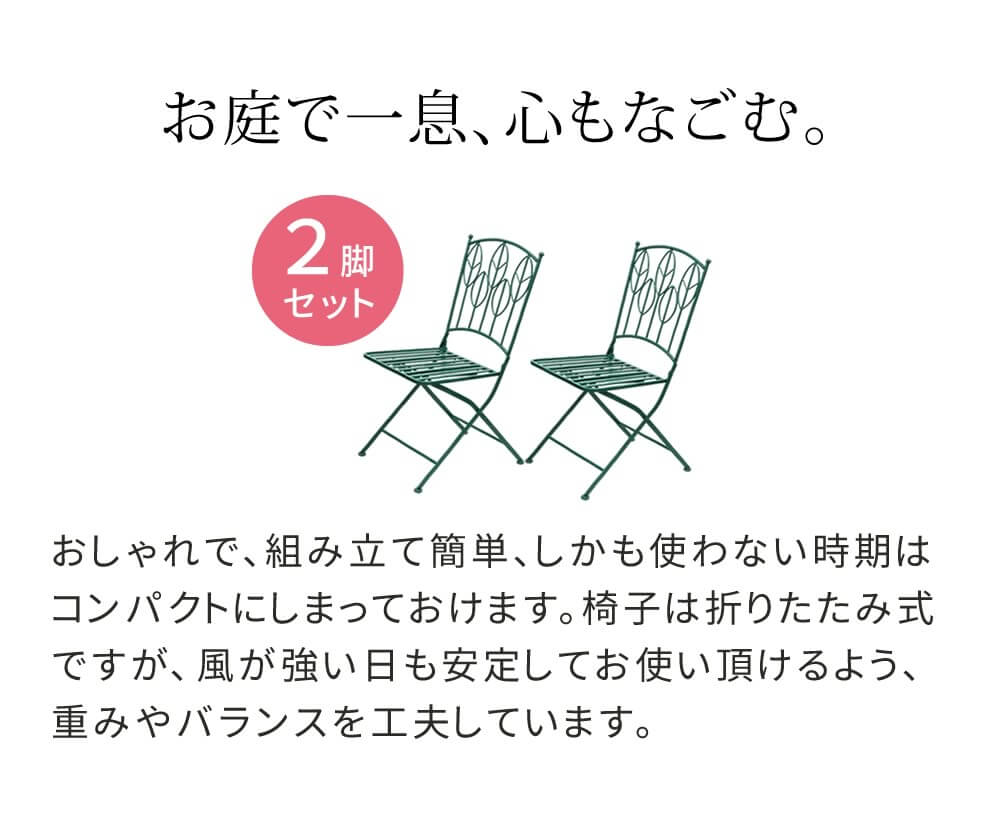 折り畳みチェアなので、使わない時期にはコンパクトに収納が可能なガーデンチェア2脚セットです。
